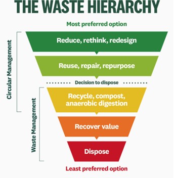 The 5 R pollution prevention hierarchy is a useful planning tool for moving towards zero waste and it supports a circular economy approach. Once all achievable opportunities at a higher level have been taken, only then should the next level be looked at. For example, opportunities for recycling should be explored only after all opportunities for reduction and reuse of materials have been exhausted.